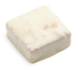 جانش الكريم بروليه الأبيض مغطى بالشوكولاتة البيضاء وملفوف في رقائق جوز الهند.