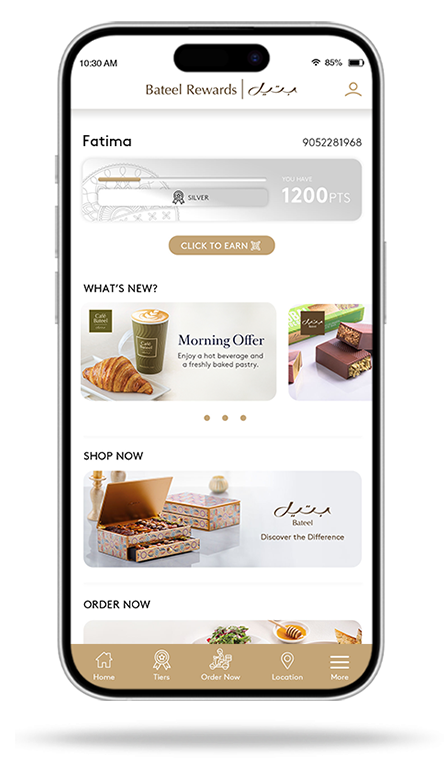 Experience the art of indulgence and be rewarded for every moment. Join Bateel Rewards to earn points, unlock benefits and enjoy exclusive privileges. Bateel Rewards loyalty programme rewards you for your purchases across Bateel Boutiques, Café Bateel and Bateel El’an restaurants and online at bateel.com.